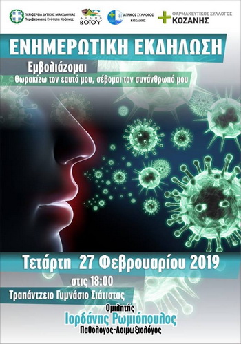 Οργανώνεται ενημερωτική εκστρατεία στην πόλη της Σιάτιστας και συγκεκριμένα στο Τραπάντζειο Γυμνάσιο Σιάτιστας την τέταρτη 27 Φεβρουάριο και ώρα 18:00. Με βασικό μήνυμα «Εμβολιάζομαι – Θωρακίζω τον εαυτό μου, σέβομαι τον συνάνθρωπο μου», με σκοπό την ενημέρωση όλου του κόσμου, στην εκδήλωση ομιλητής θα είναι ο Ιορδάνης Ρωμιόπουλος Παθολόγος – Λοιμωξιολόγος.